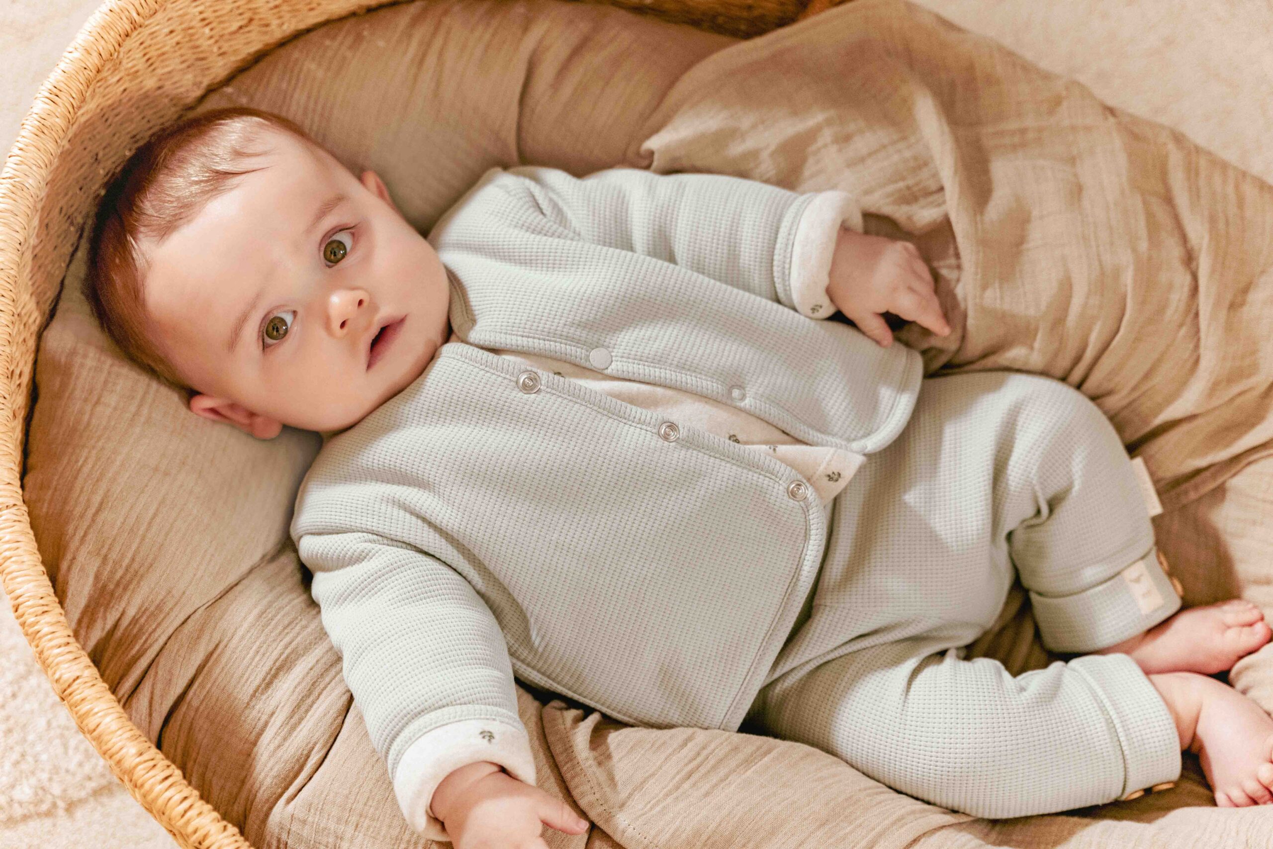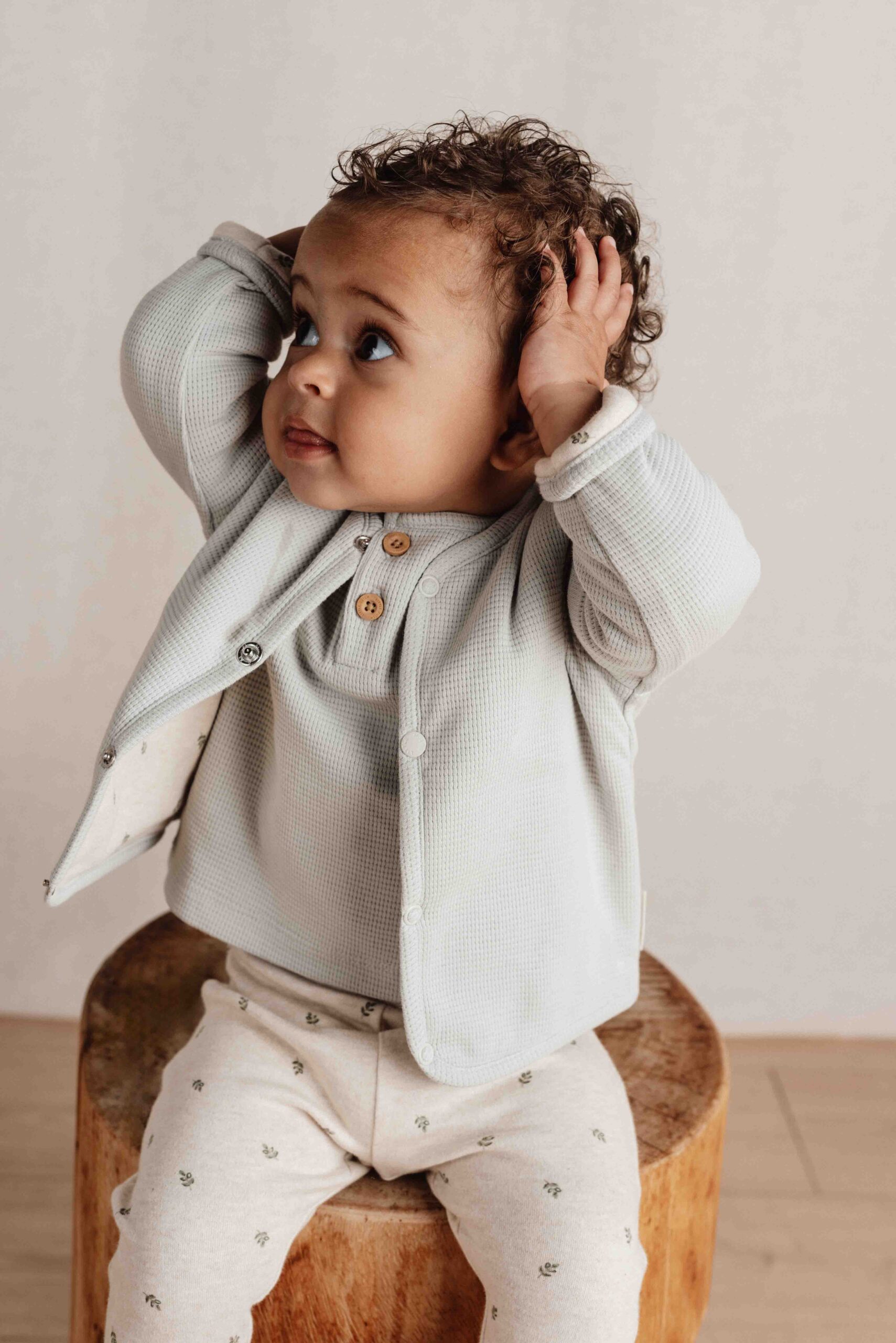 Discover nature within! This soft green cardigan is a perfect blend of style and comfort. The cardigan has a delightful waffle texture on the outside and the inside features an adorable melange colour adorned with tiny leaves. Crafted from organic cotton and designed with practicality in mind, the cardigan includes convenient snap buttons for easy dressing and a secure fit. Ideal for layering over shirts or bodysuits, it’s perfect for keeping your little one warm and stylish during any adventure. The cardigan matches seamlessly with all the items from the Little Farm collection.